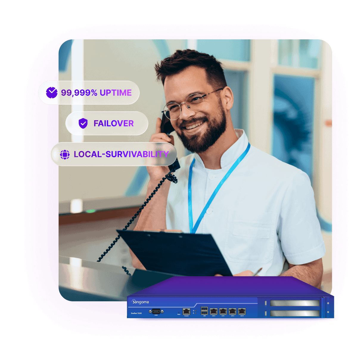 Combines cloud mobility and centralized management with on-site call control and survivability, delivering 99.999% uptime so your business stays connected, even when the internet doesn’t.